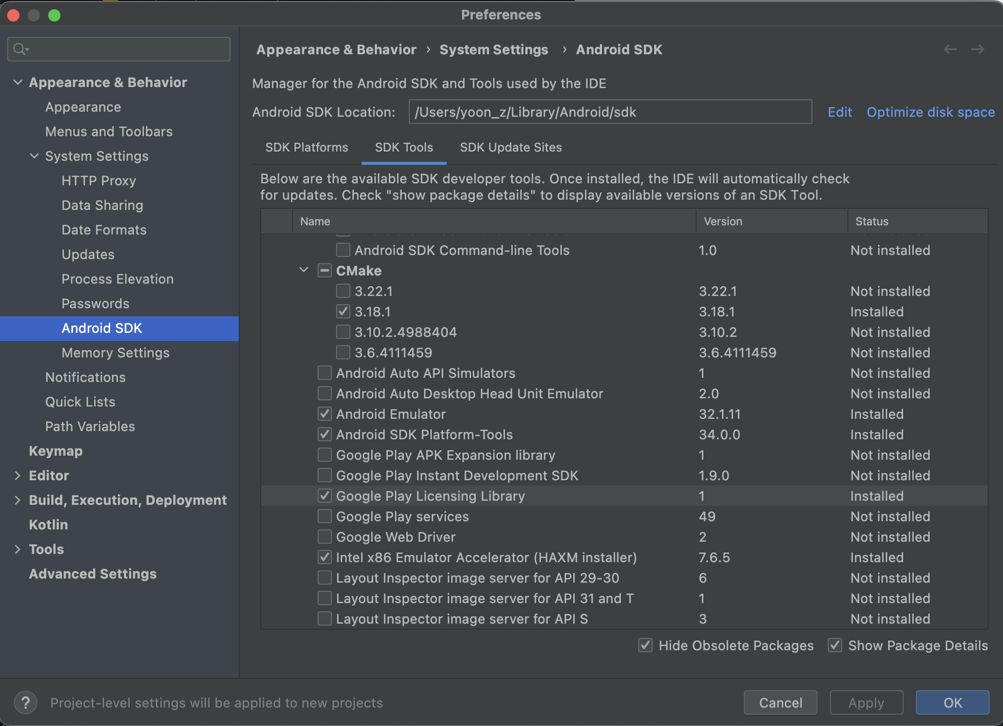 3. 안드로이드 스튜디오 - android SDK - SDK Tools - Google Play Licensing Library 체크 확인