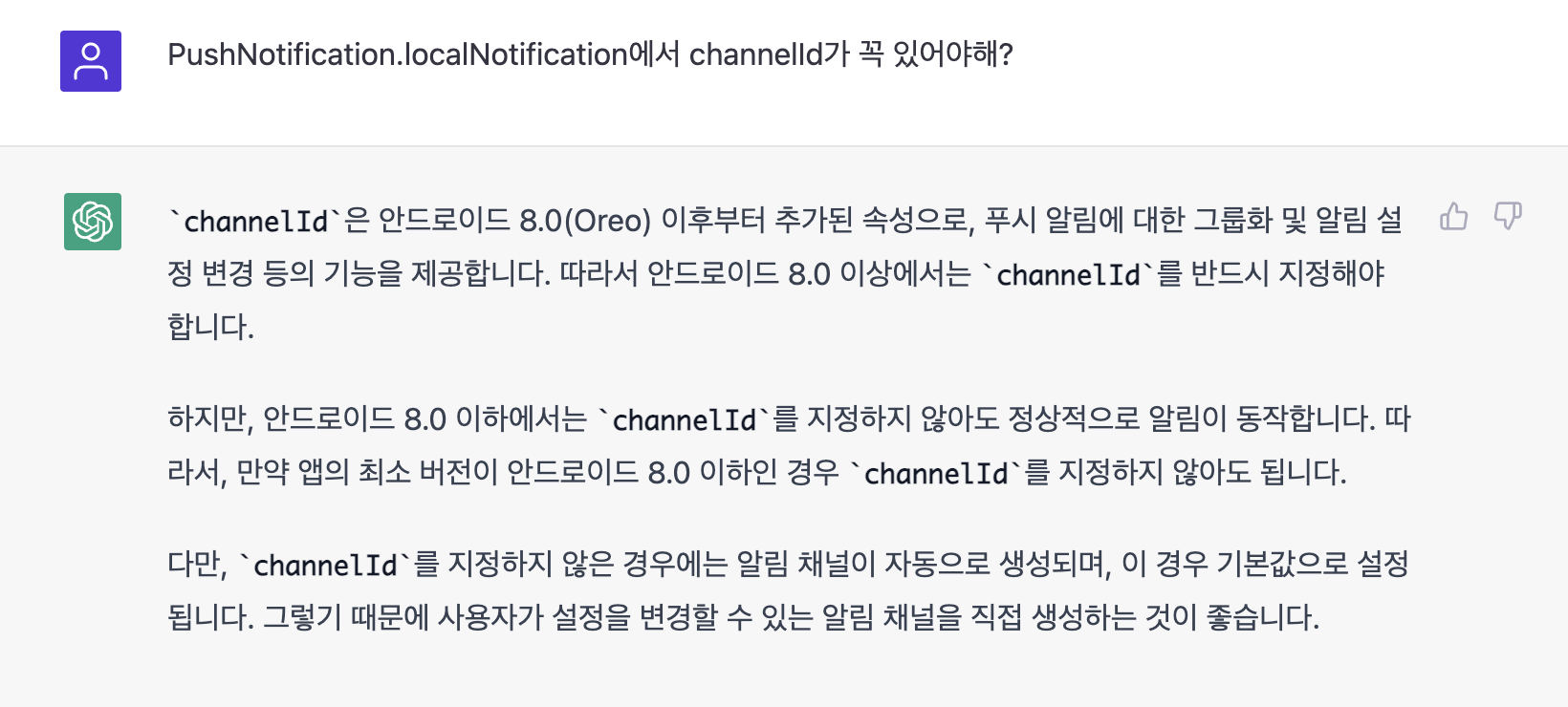 여담으로 ios에서는 없어도 작동을 하길래 채널아이디가 꼭 있어야하는지 물어봤는데 똑똑이 chat gpt가 이유를 알려주었다.