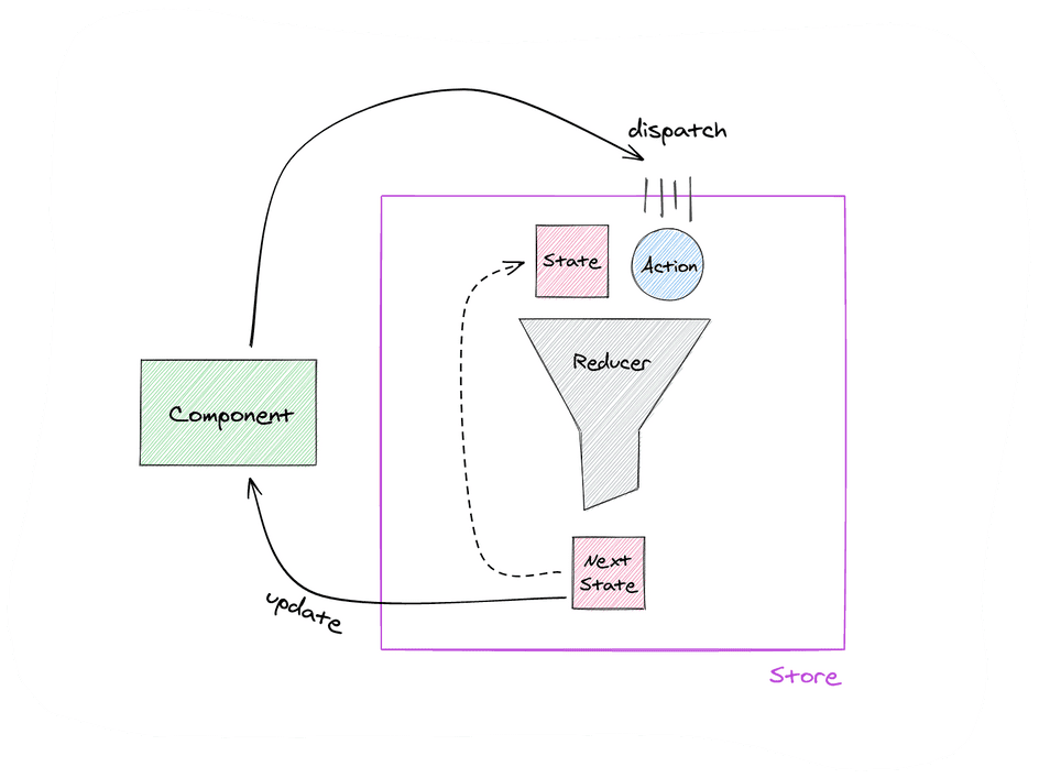 - 구성 : 현재의 앱 상태 / 리듀서 / 몇가지 내장 함수들(dispatch, subscribe..)