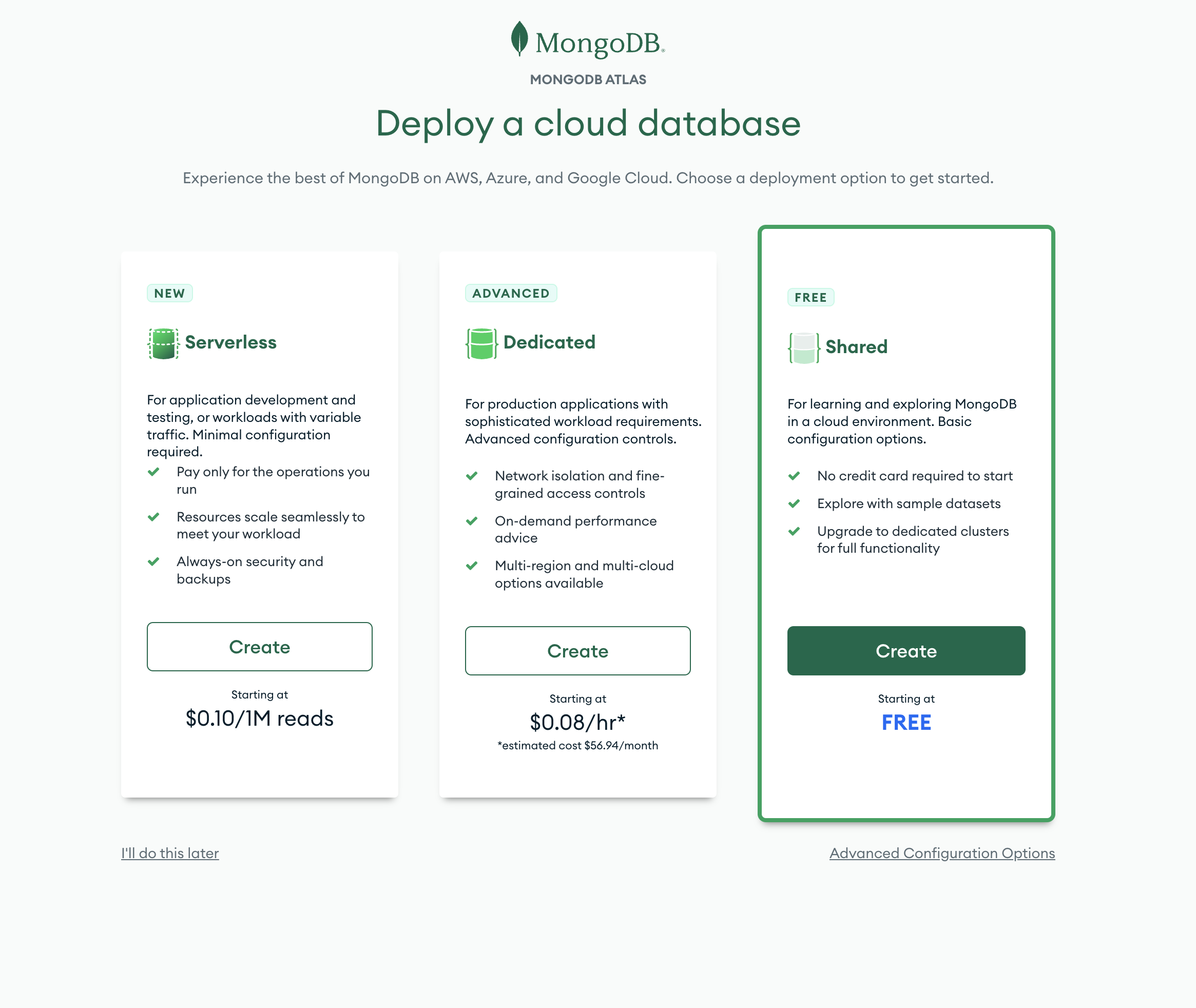 2. 클라우드 데이터베이스는 우측의 FREE Shared를 이용했다.