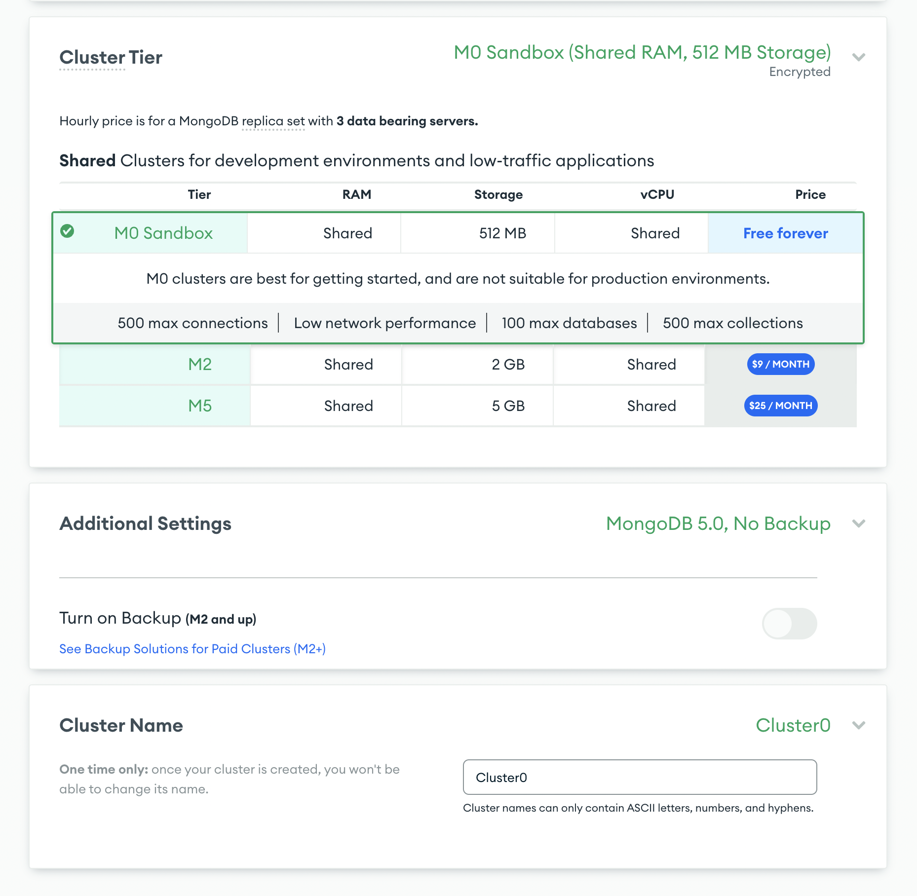 클러스터 M0 등급은 스토리지크기가 512MB 정도 된다.