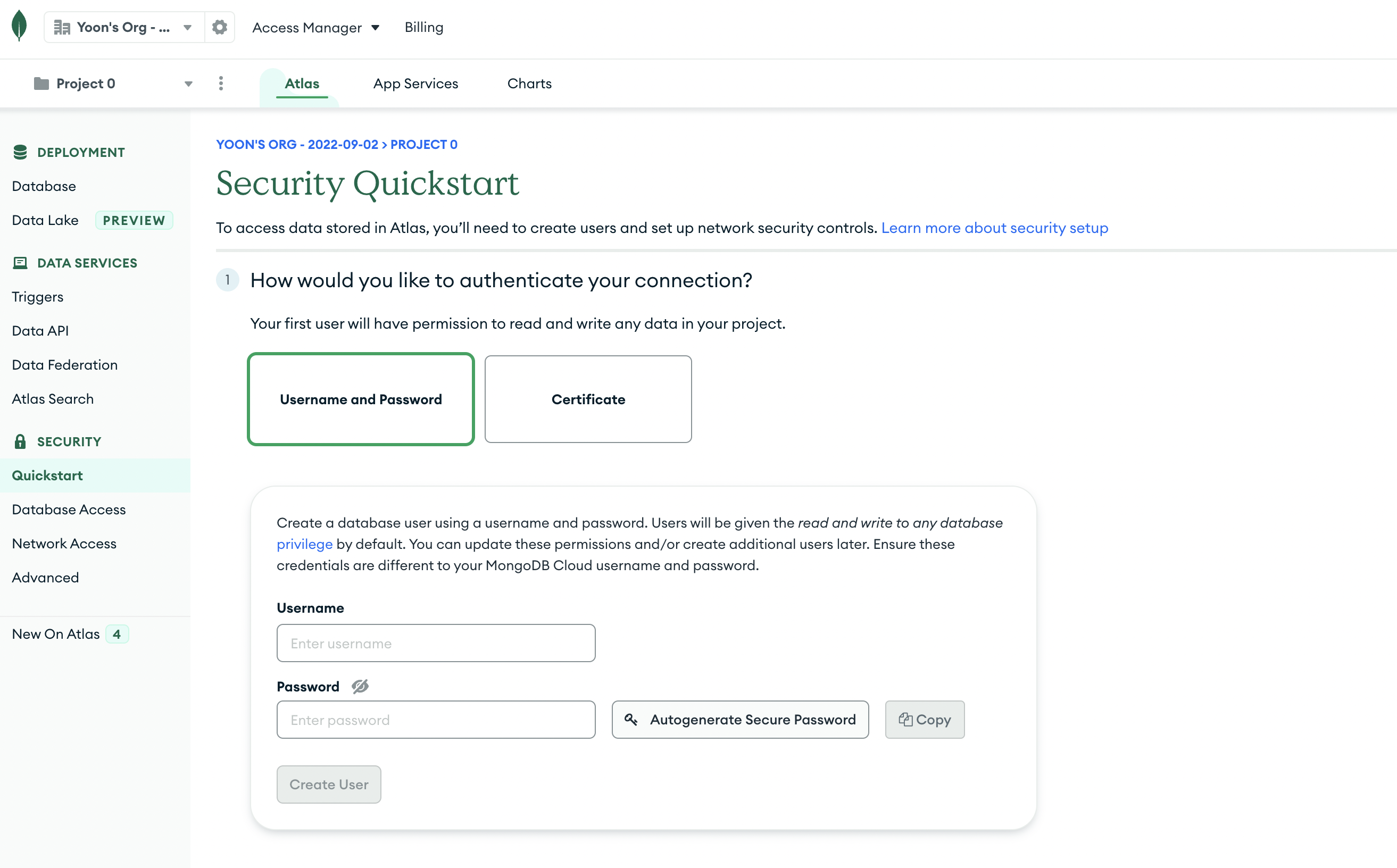 -이 때 작성한 유저네임과 패스워드를 기억을 해둬야한다. 나중에 앱과 연결할때 사용된다.