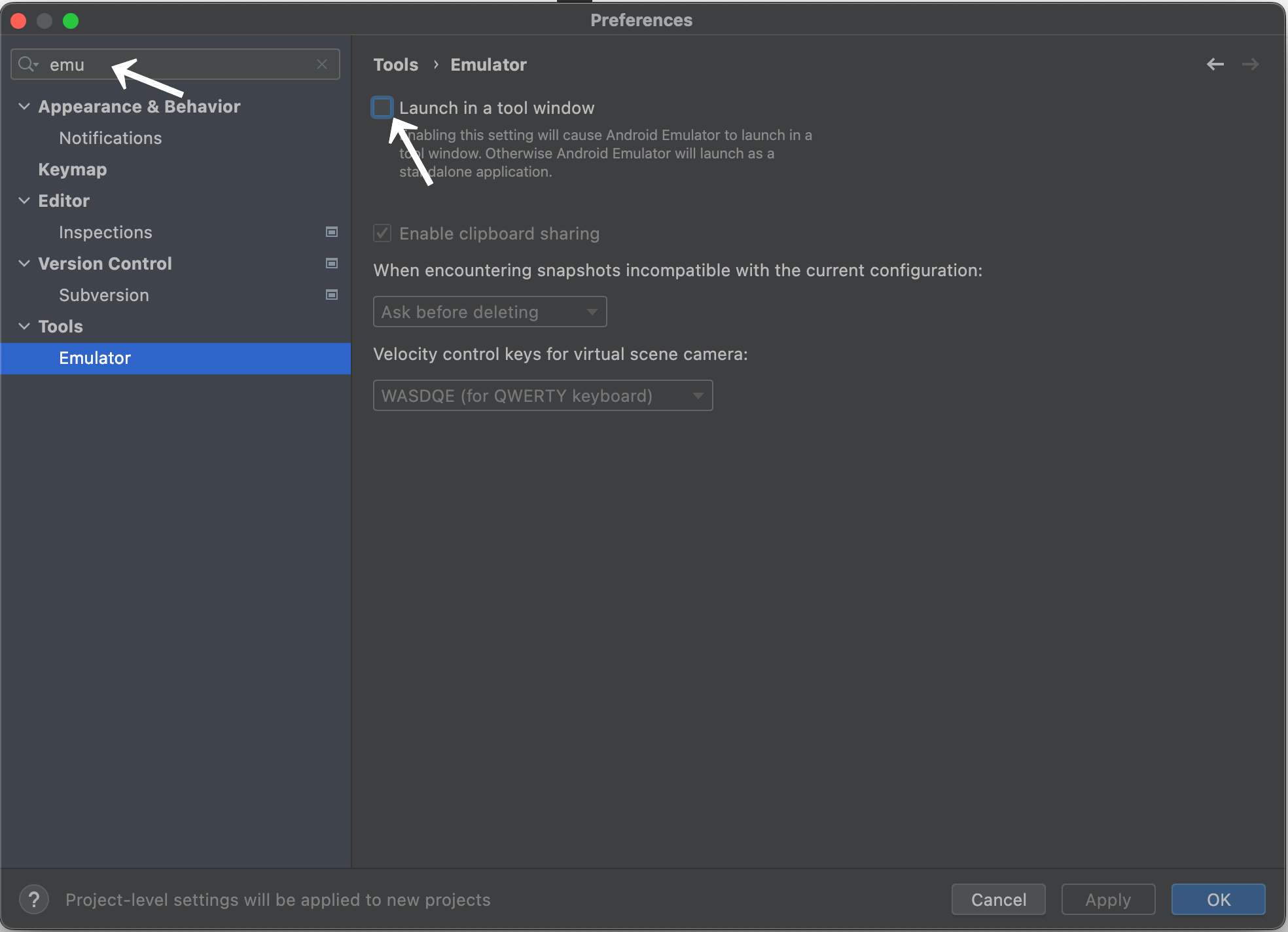 최근 업데이트 된 안드로이드 스튜디오에선 애뮬레이터가 고정되어 있다.
