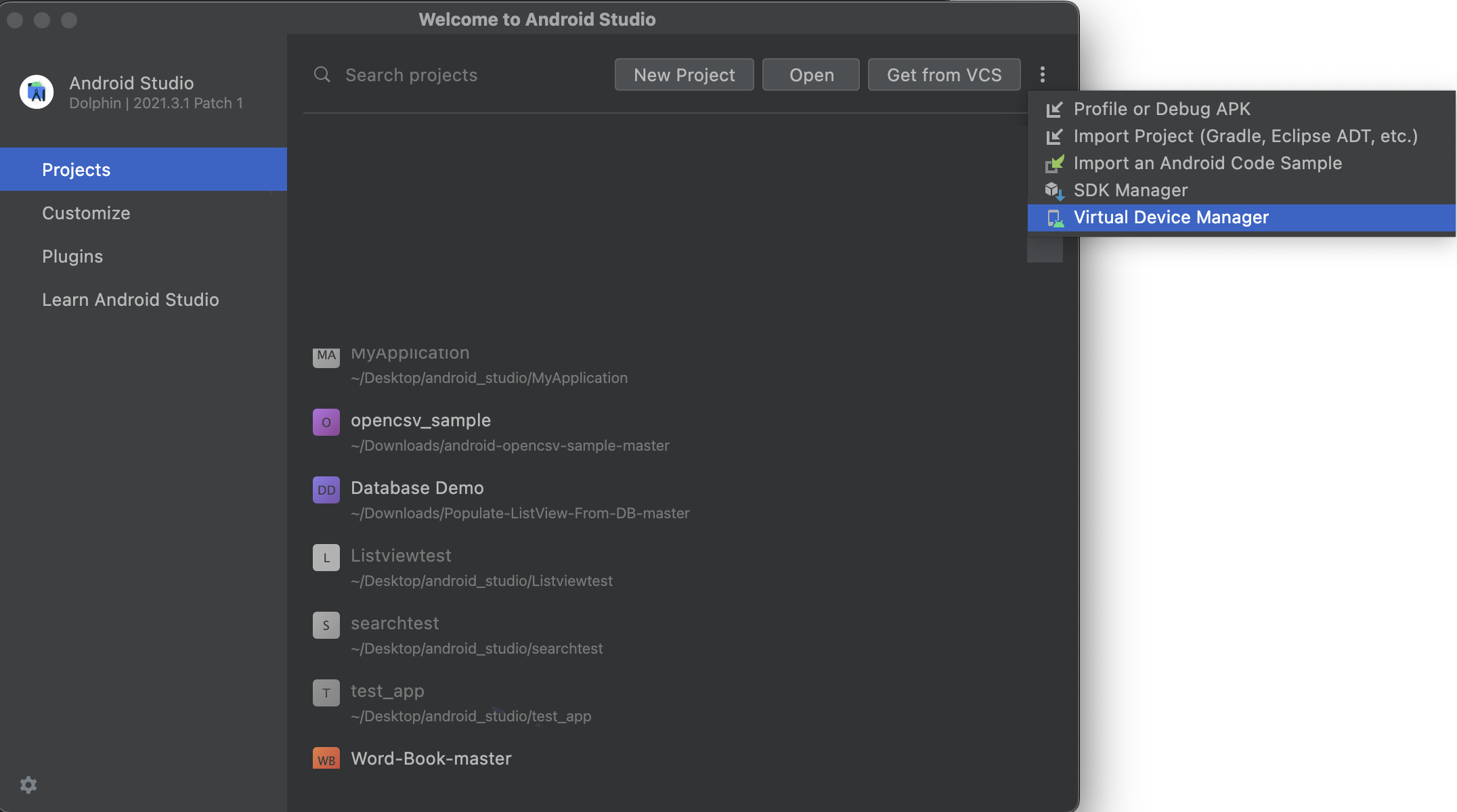 5. 오른쪽에 점세개 아이콘을 눌러 Virtual Device Manager에 들어간다.